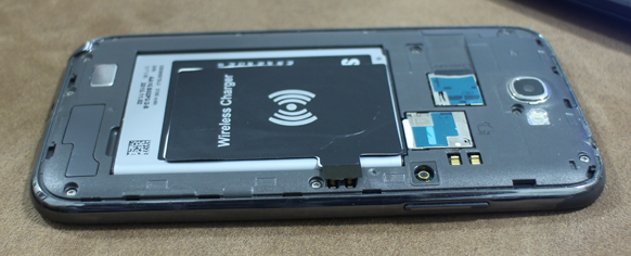 จากนั้นเปิดฝาหลังเครื่องโทรศัพท์ ก็จะเห็นขั้วสำหรับต่อกับแผ่น Wireless receiver ด้านใน (ตรงที่วงกลมไว้ครับ)